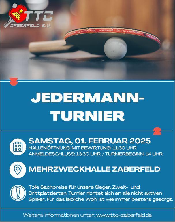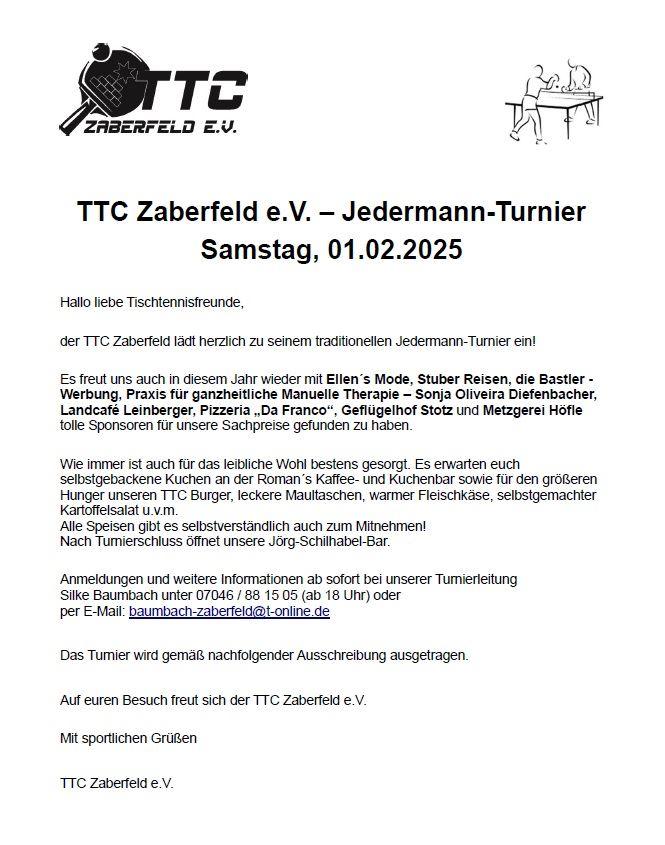 Am Samstag, den 1. Februar 2025 heißt es wieder „An die Platte fertig los!“ Unser traditionelles Jedermann-Turnier findet wieder statt und lädt alle Tischtennis Begeisterte in die Zaberfelder Mehrzweckhalle ein. Die Halle ist bereits ab 11:30 Uhr geöffnet und bewirtet. Turnierbeginn ist um 14 Uhr. Neben kühlen und warmen Getränken, verwöhnen wir Sie mit selbstgebackenen Kuchen, unserem legendären TTC-Burger, leckeren Maultaschen, warmen Fleischkäse, selbstgemachten Kartoffelsalat u.v.m. Alle Speisen gibt es auch zum Mitnehmen. Barbetrieb mit Musik am Abend.