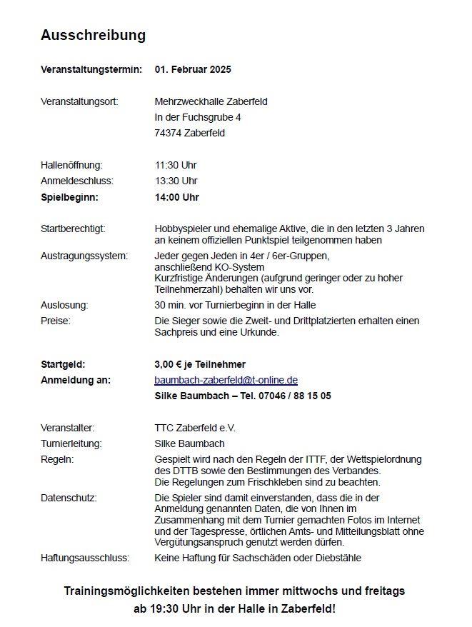 Für alle Teilnehmer bestehen bis zum Turnierbeginn immer mittwochs und freitags ab 19:30 Uhr in der Mehrzweckhalle Trainingsmöglichkeiten. Um vorherige Anmeldung zum Turnier wird gebeten: Silke Baumbach (07046/881505, baumbach-zaberfeld@t-online.de). Anmeldeschluss am Turniertag ist um 13:30 Uhr.